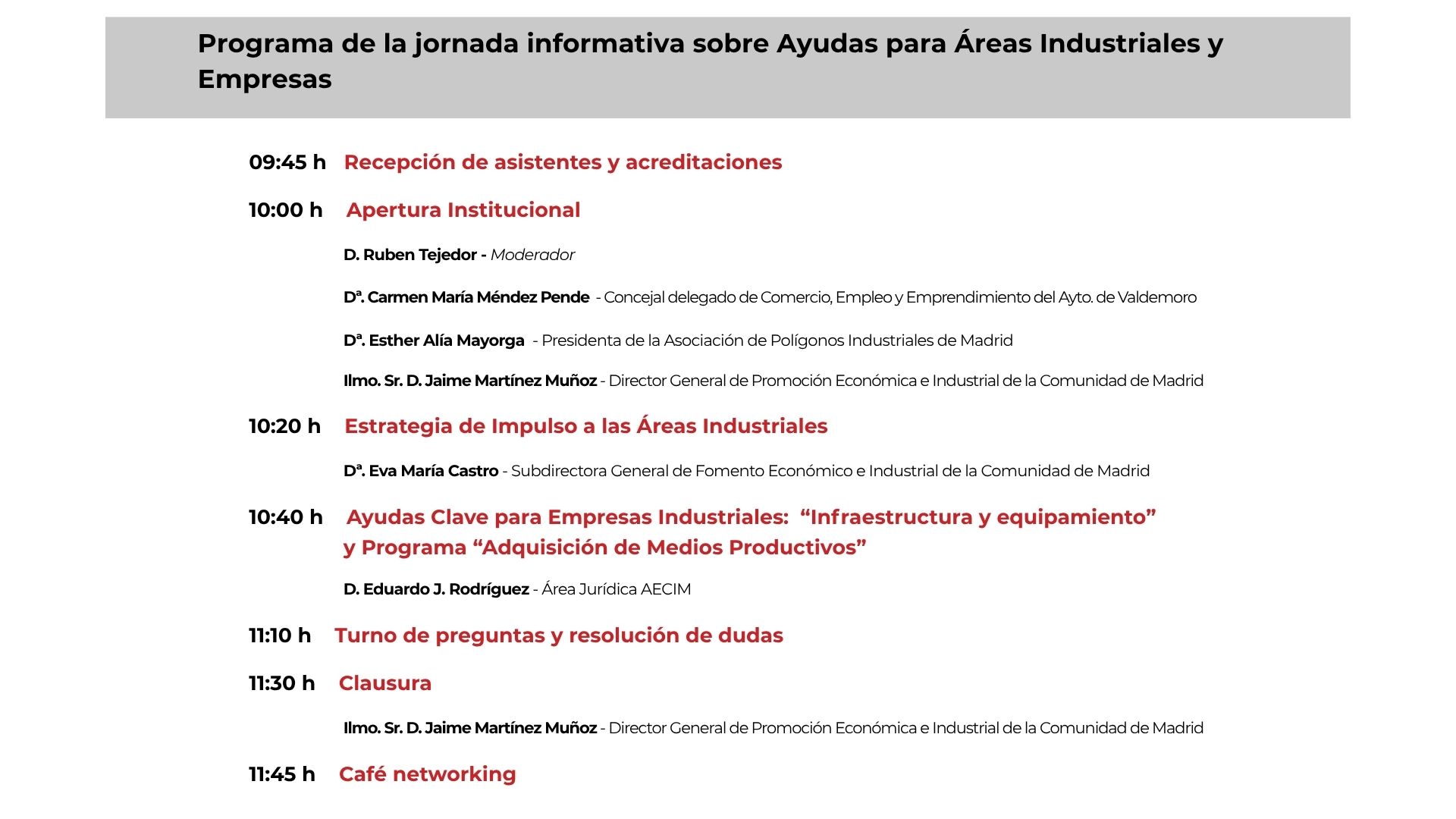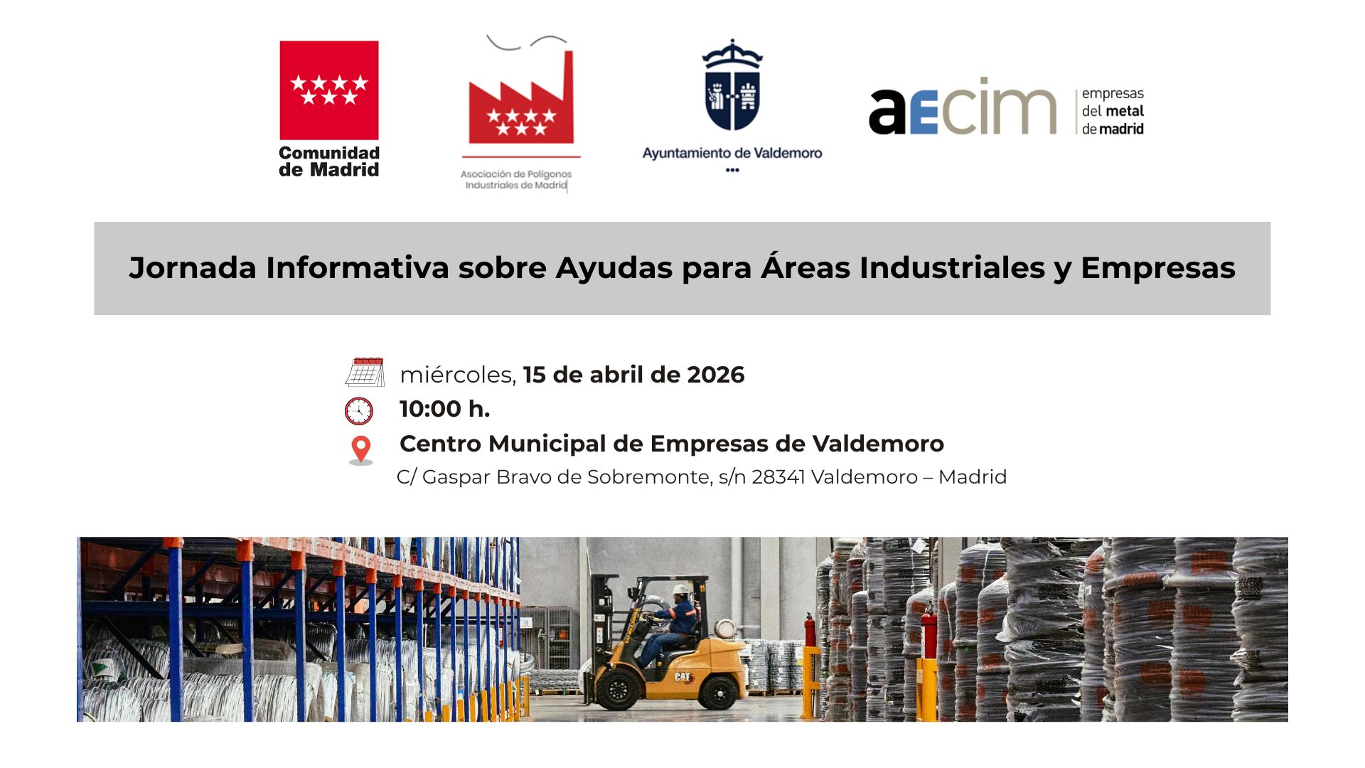Desde el Ayuntamiento de Valdemoro, en colaboración con la Comunidad de Madrid y la Asociación de Polígonos Industriales de Madrid, nos complace invitarle a la Jornada Informativa sobre Ayudas para Áreas Industriales y Empresas.